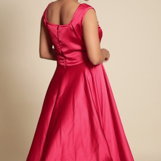 Crimson Radiance is the embodiment of bold elegance and timeless allure. Crafted from lustrous premium satin, this sleeveless A-line dress flows gracefully with every step, creating a captivating silhouette. The vibrant crimson hue, combined with its fluid drape, makes it the ideal choice for women who wish to stand out with confidence and sophistication.